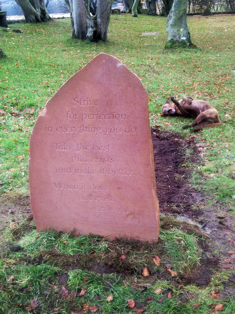 Hand-carved headstone memorial sandstone with pike motif, Gordonstoun School