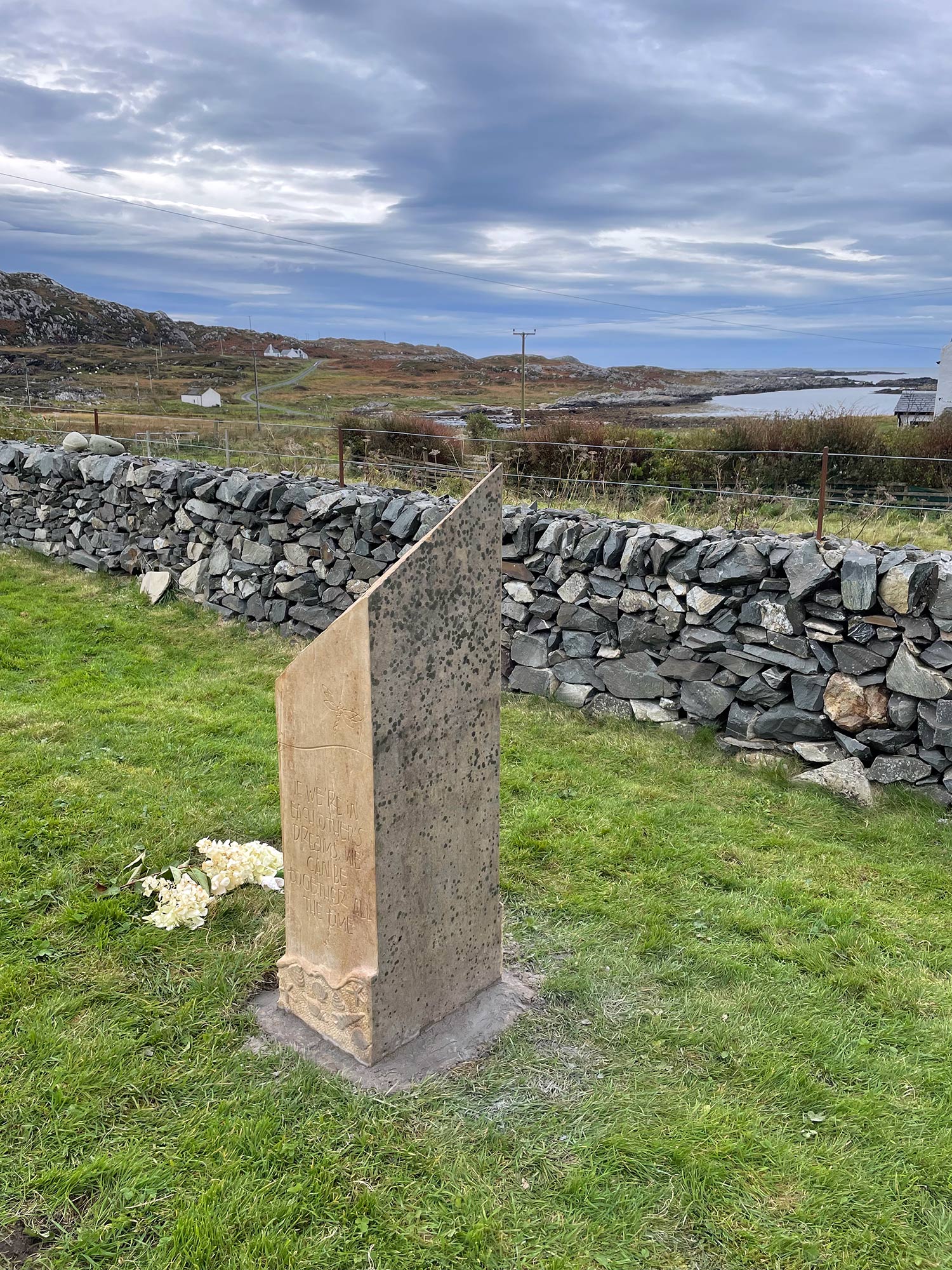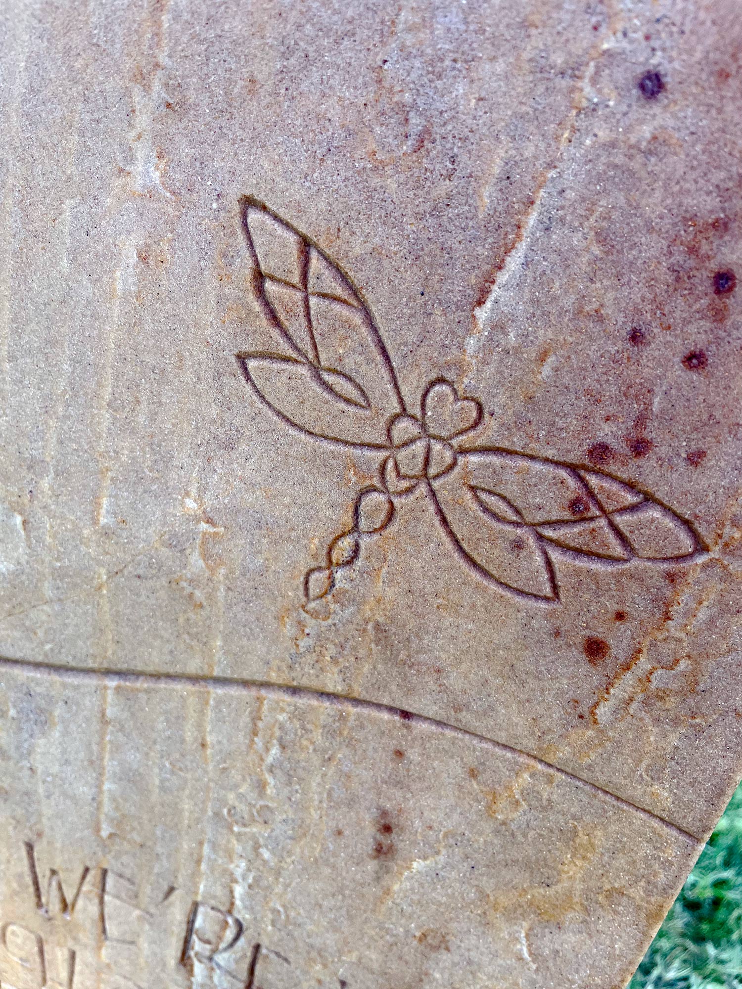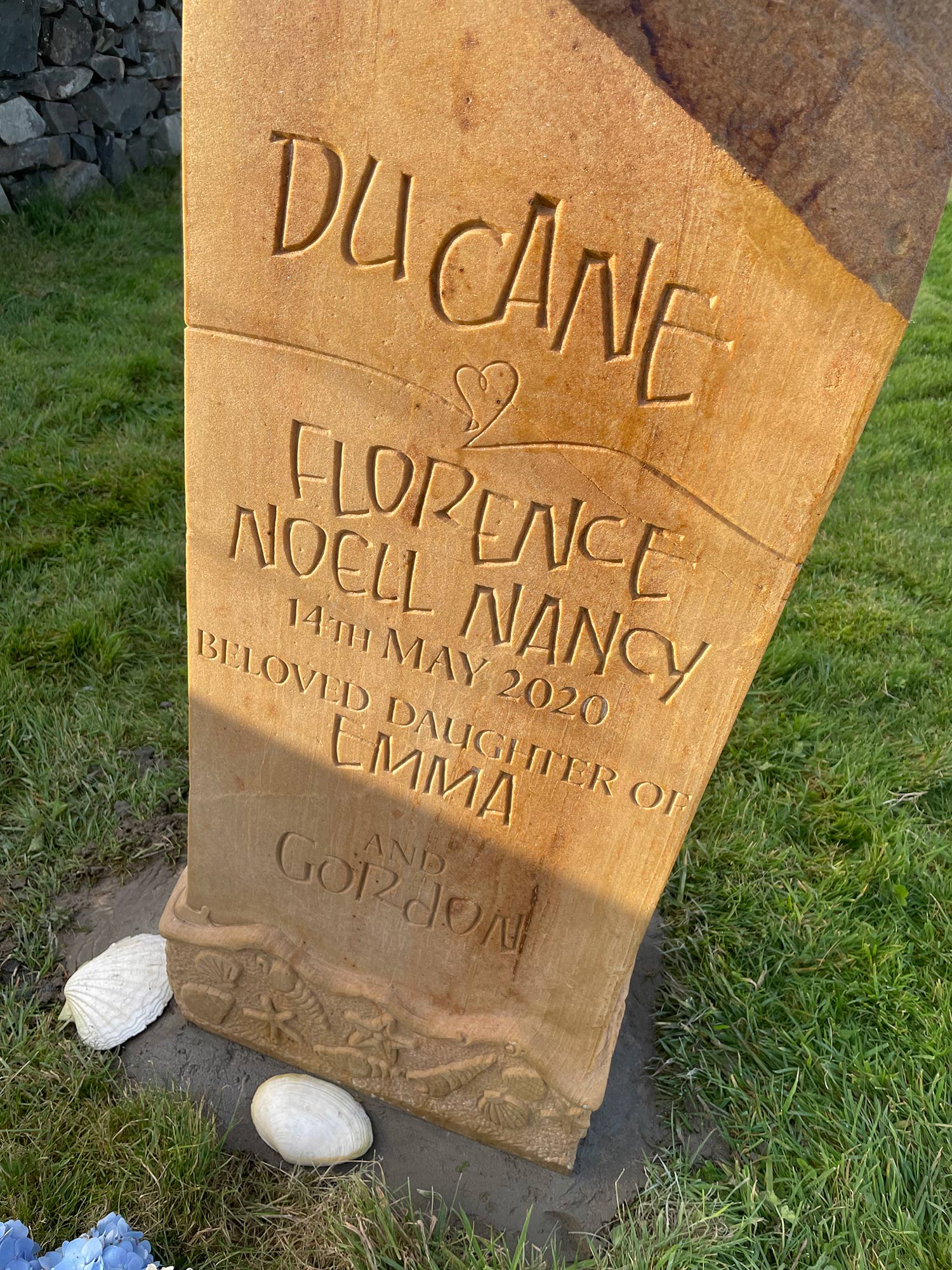 This was a very hard commission to complete – memorial for a baby, installed on the beautiful Hebridean island of Colonsay. Clashach sandstone pillar carved on three sides with dragonfly, oystercatcher and seashells.