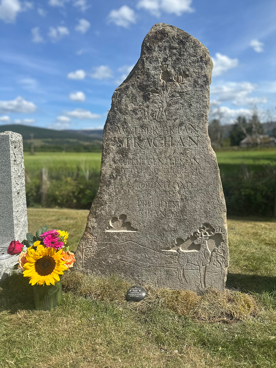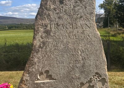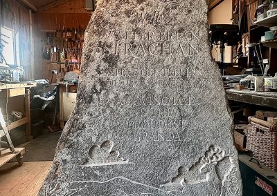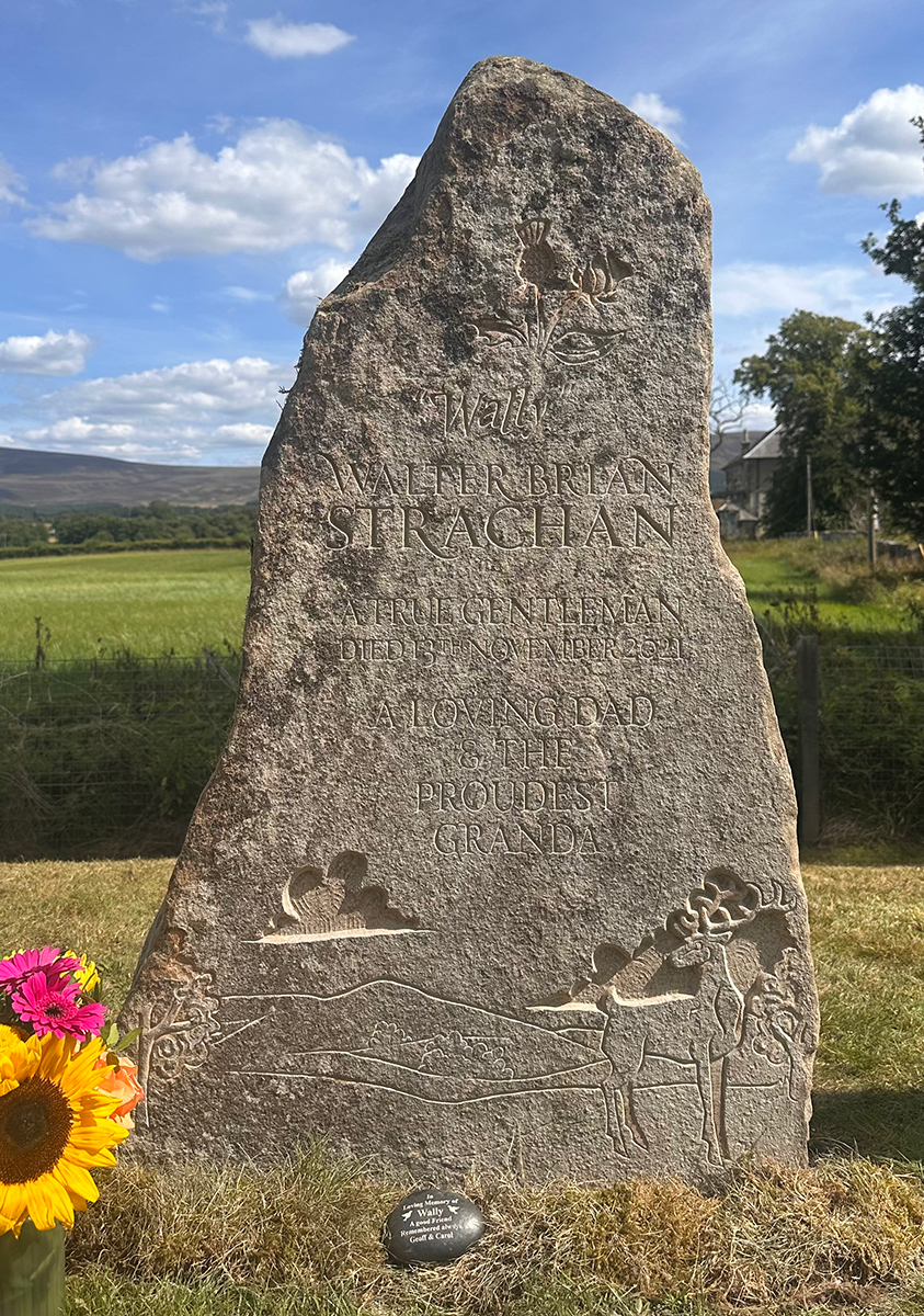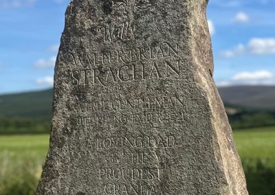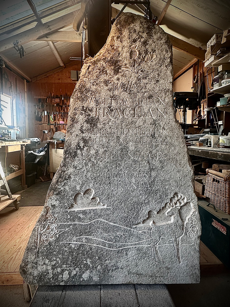 This is a headstone I carved recently for a very good friend who tragically lost his father to an accident. It was very hard for all involved but the process was very cathartic. Wull was local to where I love and his son and I drove round the fields and hills looking for just the right stone. We settled on this one and got about coming up with the right design. On it we have a resplendent red deer stag standing in front of the very view that can be seen from the lair in Cromdale kirkyard. It shows the Cromdale hills in the background. At the top we have entwined rose and thistle for Wull’s parentage. The stone was installed on a stunning summer’s day.