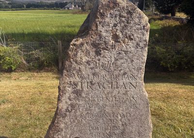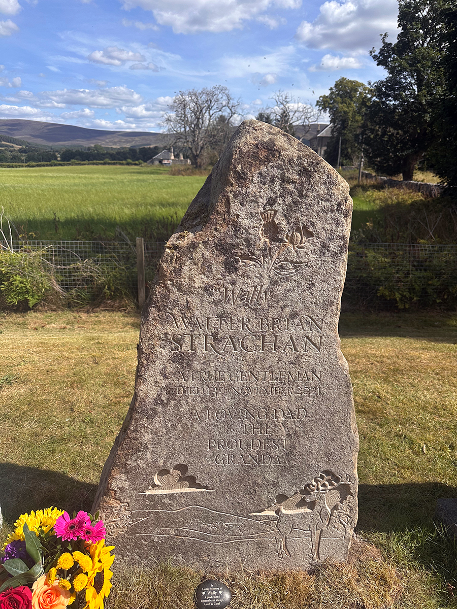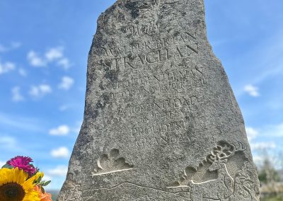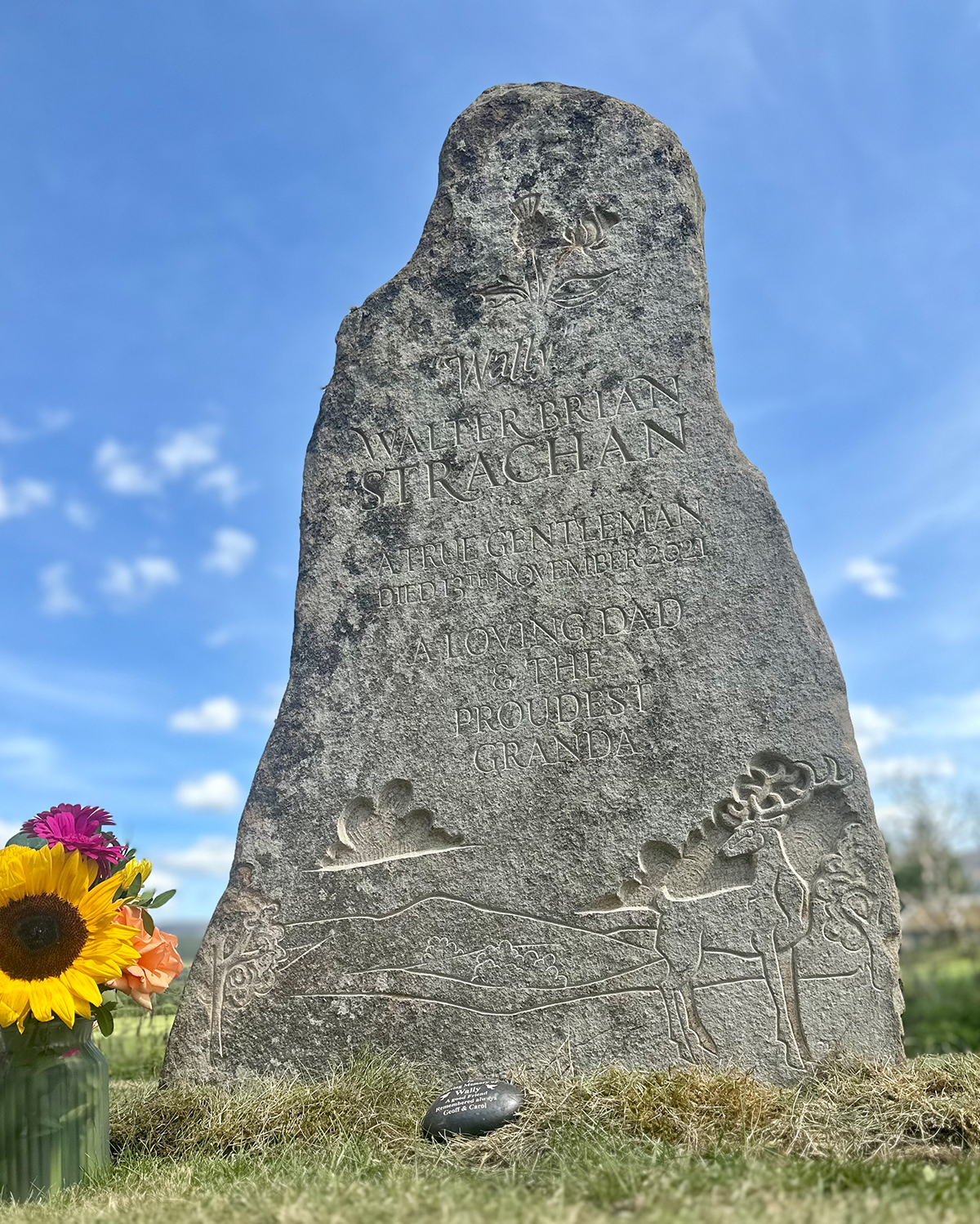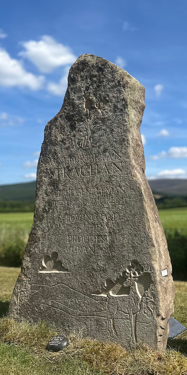 This is a headstone I carved recently for a very good friend who tragically lost his father to an accident. It was very hard for all involved but the process was very cathartic. Wull was local to where I love and his son and I drove round the fields and hills looking for just the right stone. We settled on this one and got about coming up with the right design. On it we have a resplendent red deer stag standing in front of the very view that can be seen from the lair in Cromdale kirkyard. It shows the Cromdale hills in the background. At the top we have entwined rose and thistle for Wull’s parentage. The stone was installed on a stunning summer’s day.