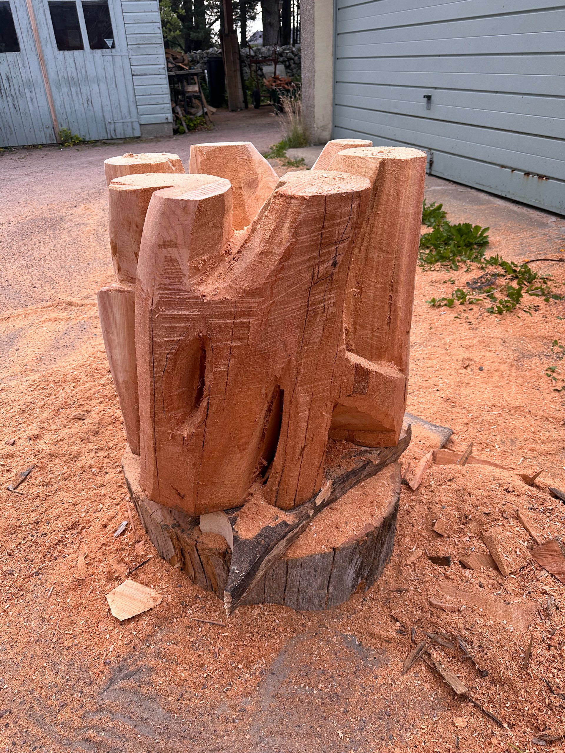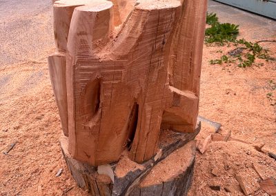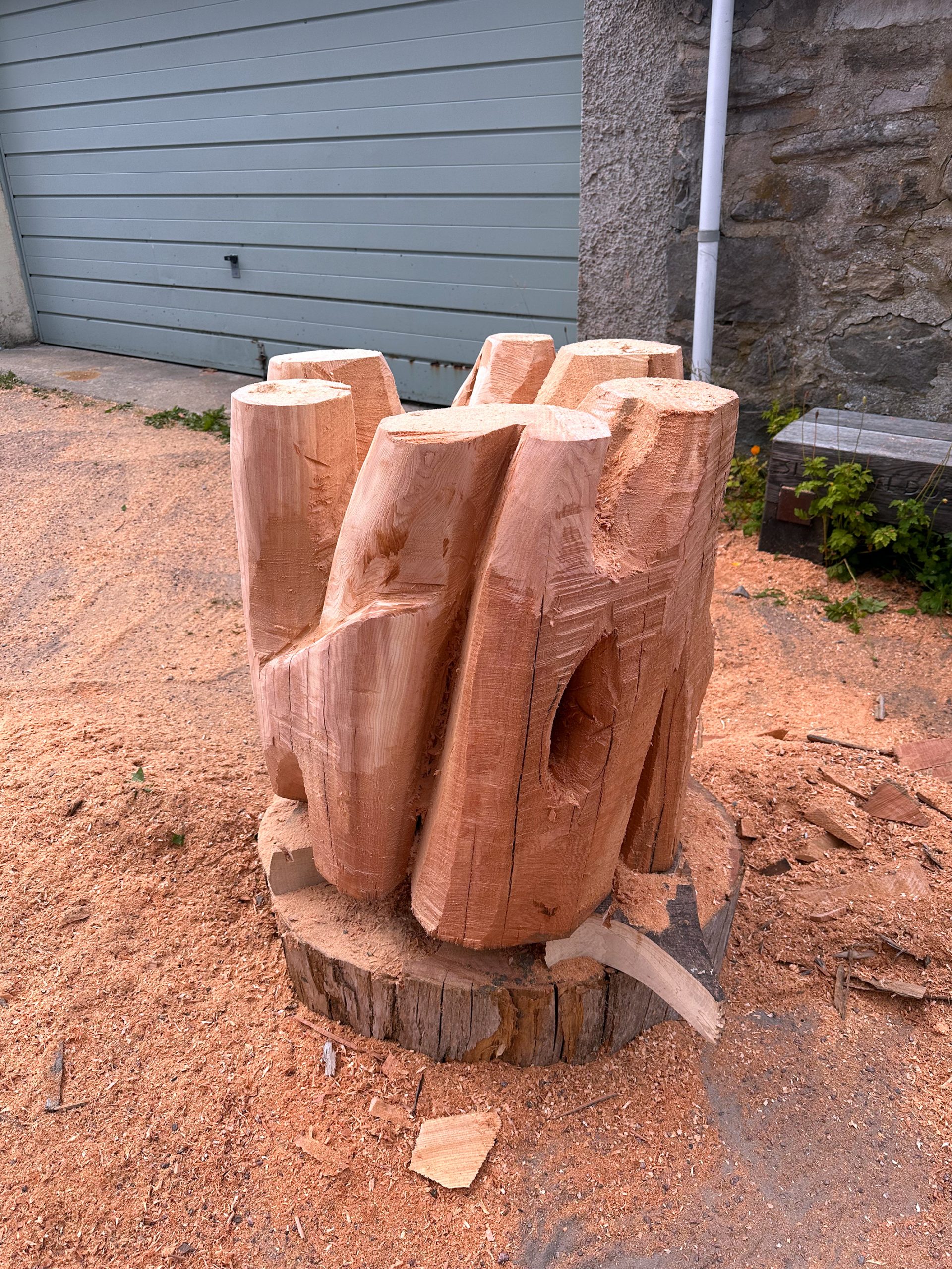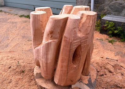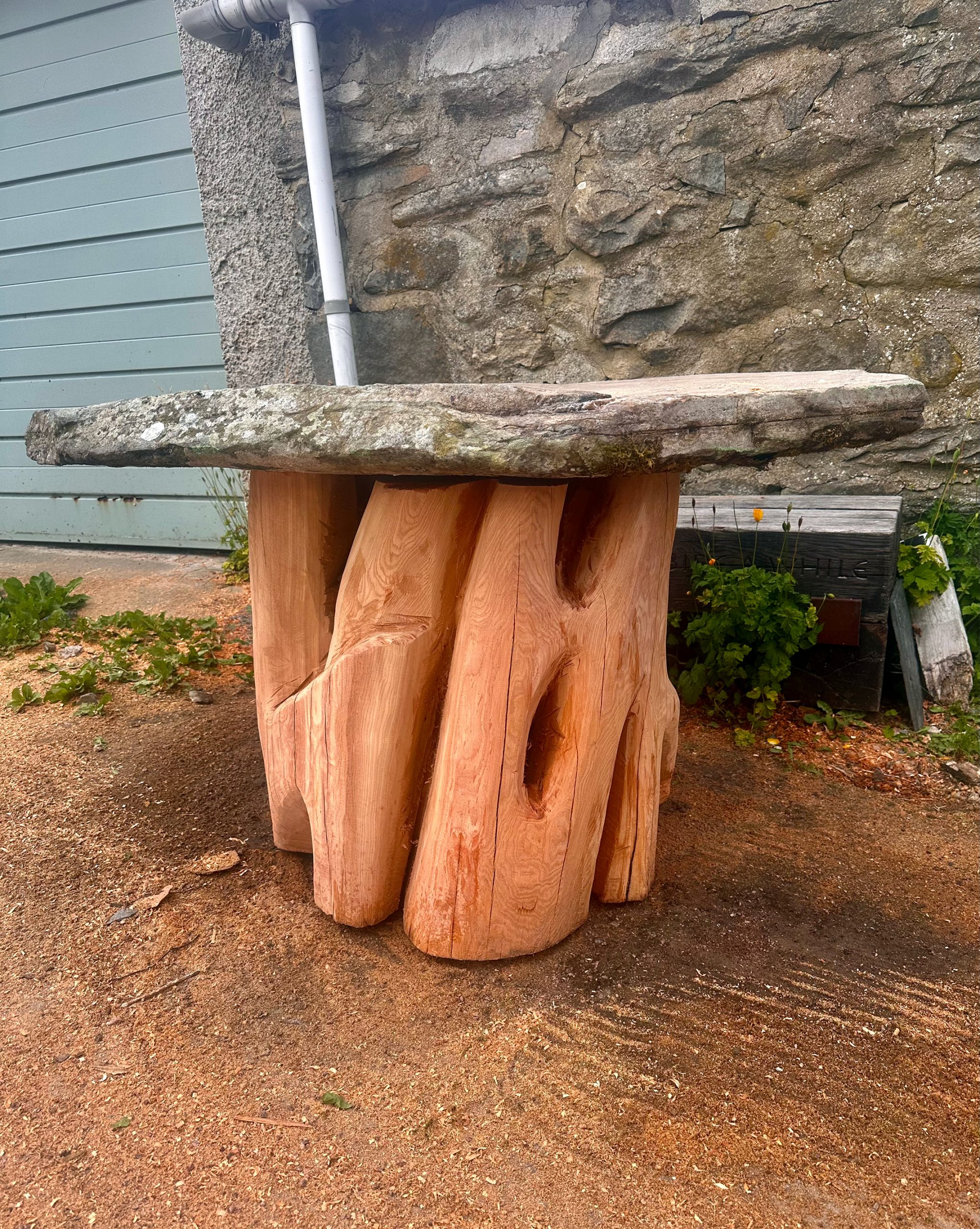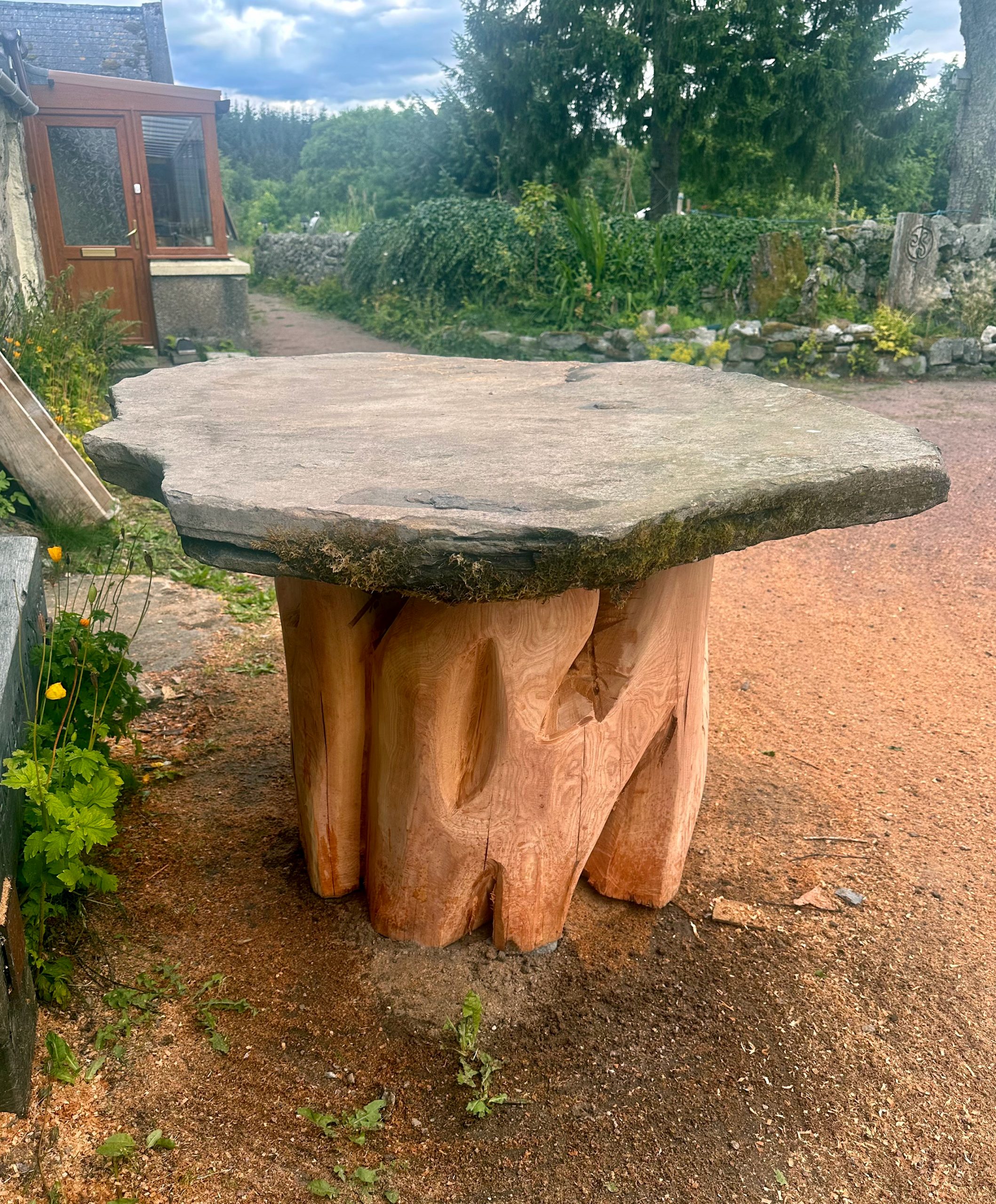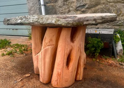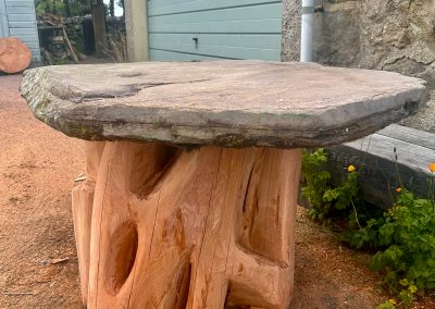 Whilst out scouring the surrounding hills for “carveable” field stones with a friend recently, we came across a big, flat slab. It immediately suggested itself as a table top. I then flicked through my stock of tree trunks and got about carving a base for it. It now sits in my front yard where I can watch the setting sun with suitable imbibement.