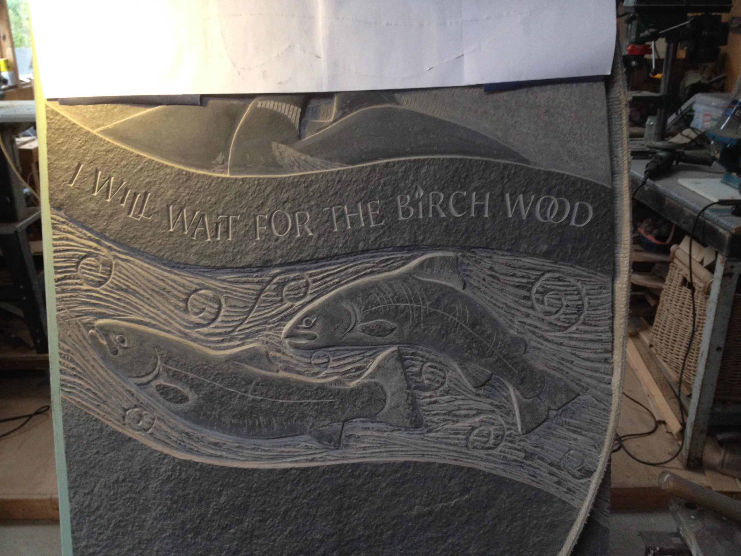 A couple commissioned me to produce this garden piece to commemorate their upcoming wedding. Caithness stone slab featuring salmon, mountain outline, great northern divers, birch trees, North star and celtic triskele. Also featuring a line from the poem, Hallaig, by the acclaimed Scottish gaelic poet, Sorley MacLean.
