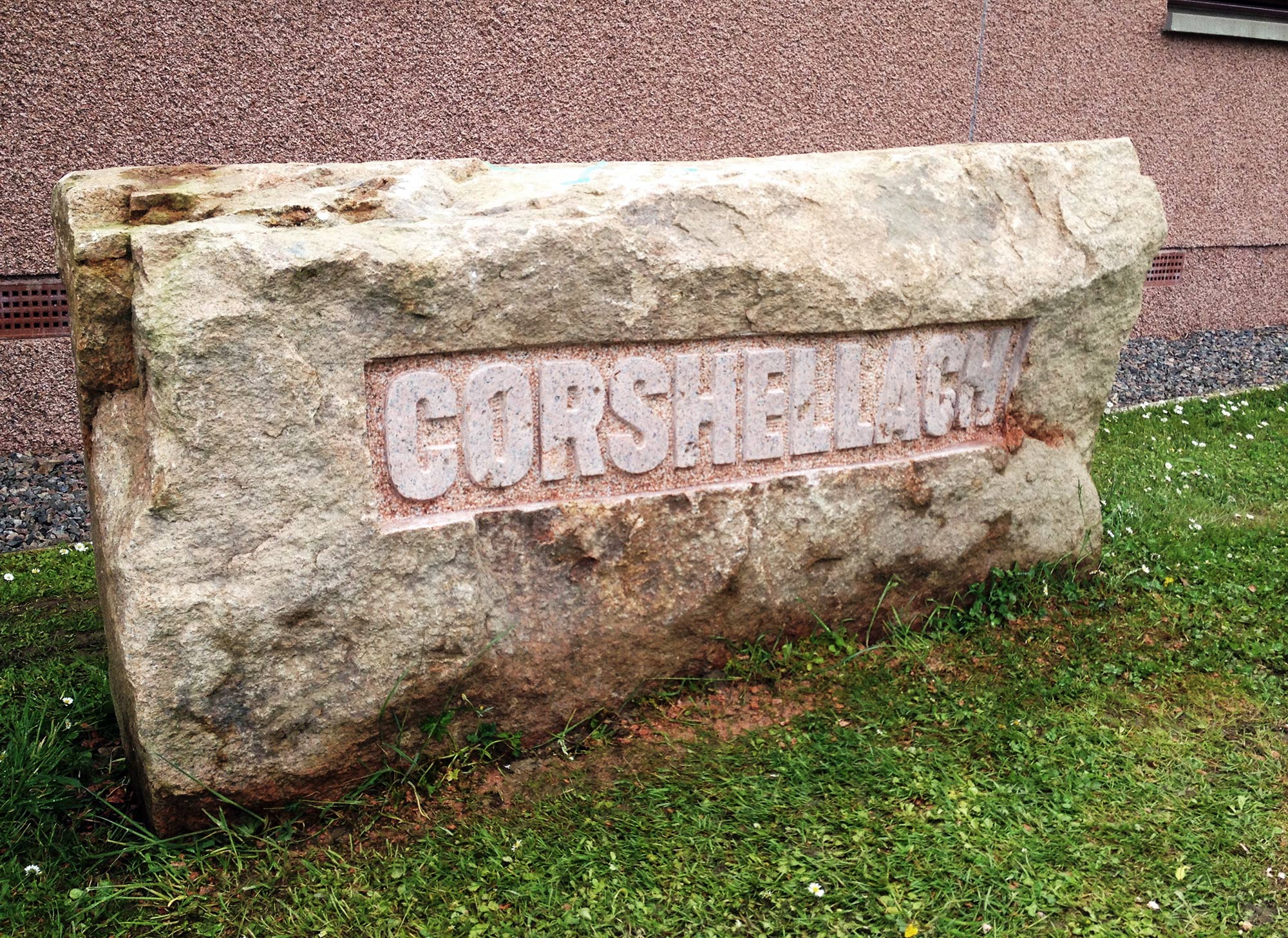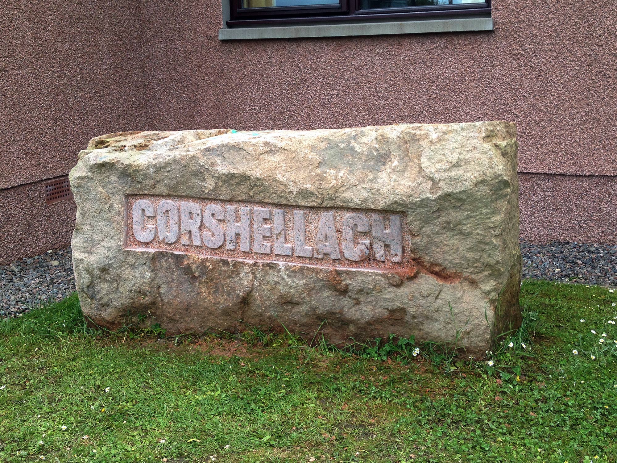 Corshellach house name carved in a large pink granite boulder in the front garden.