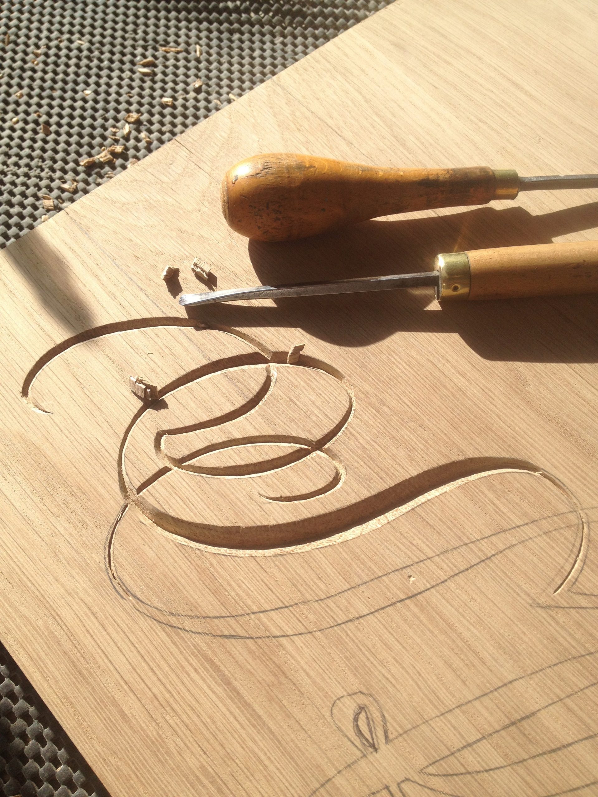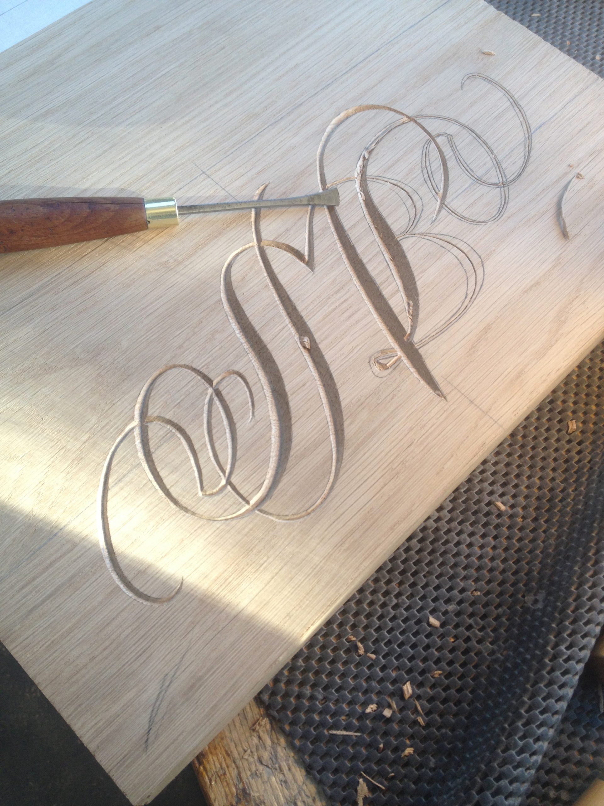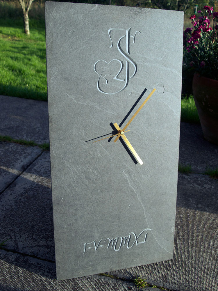 Hand-carved lettering on wooden clock, wedding gift