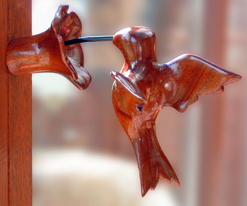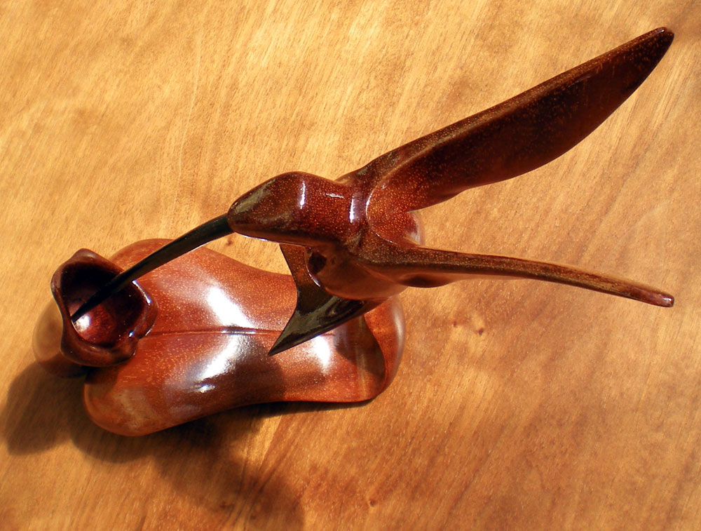 Ruby-throated hummingbird in mahogany with ruby inset