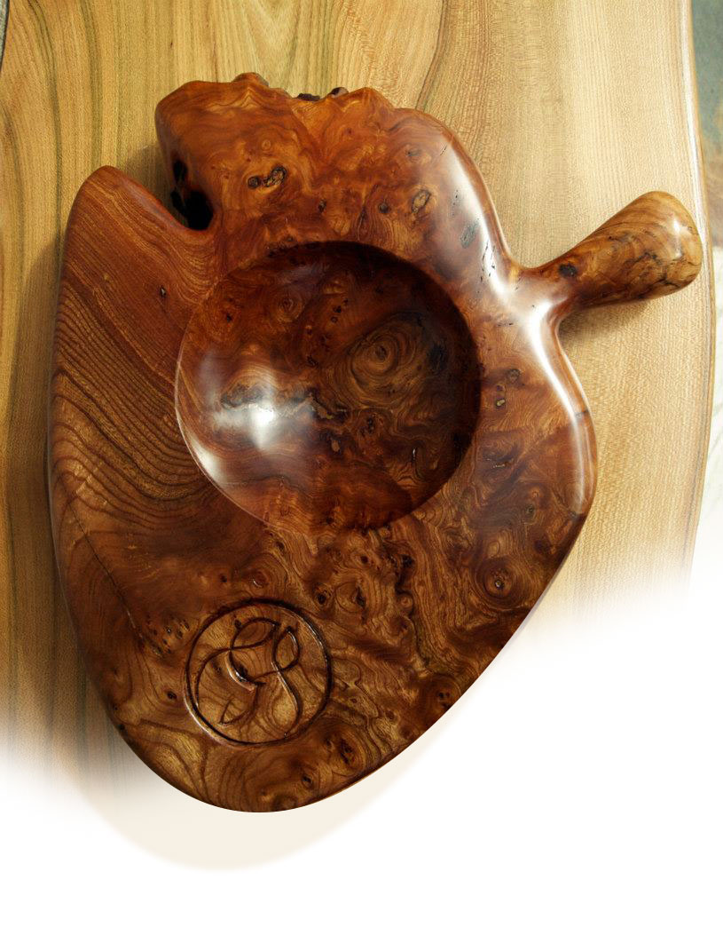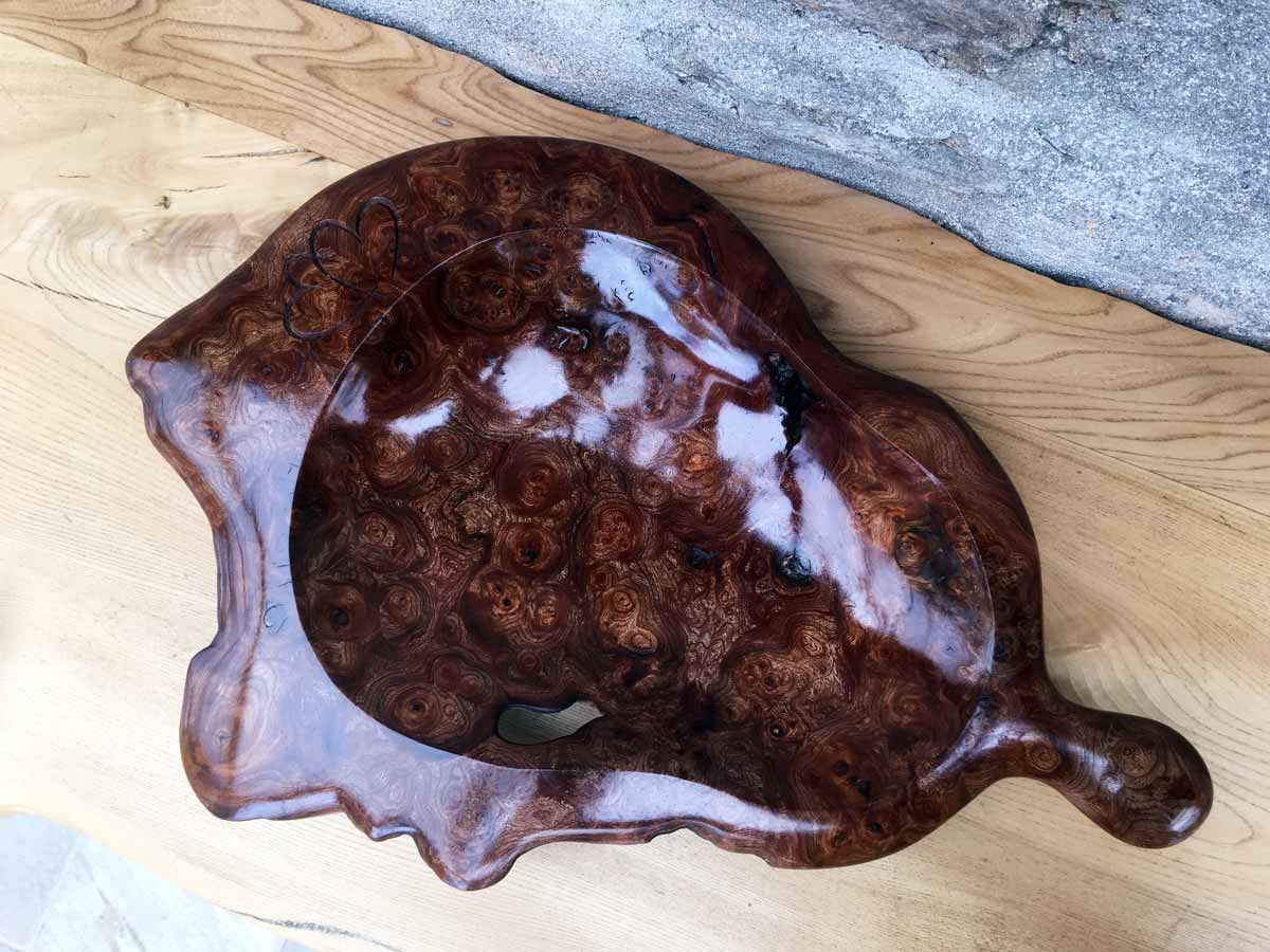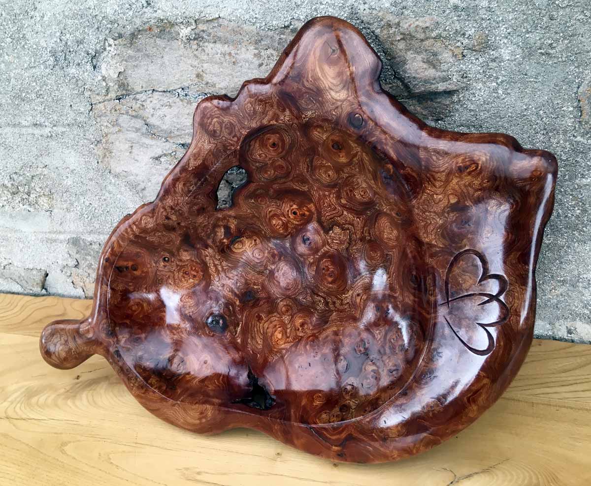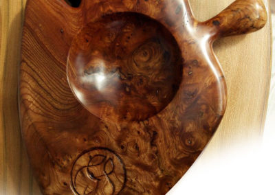 Hand-carved initials on elm cheese board, Christmas gift