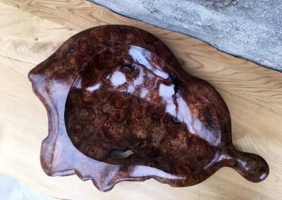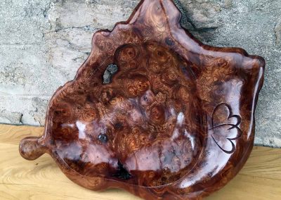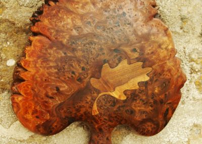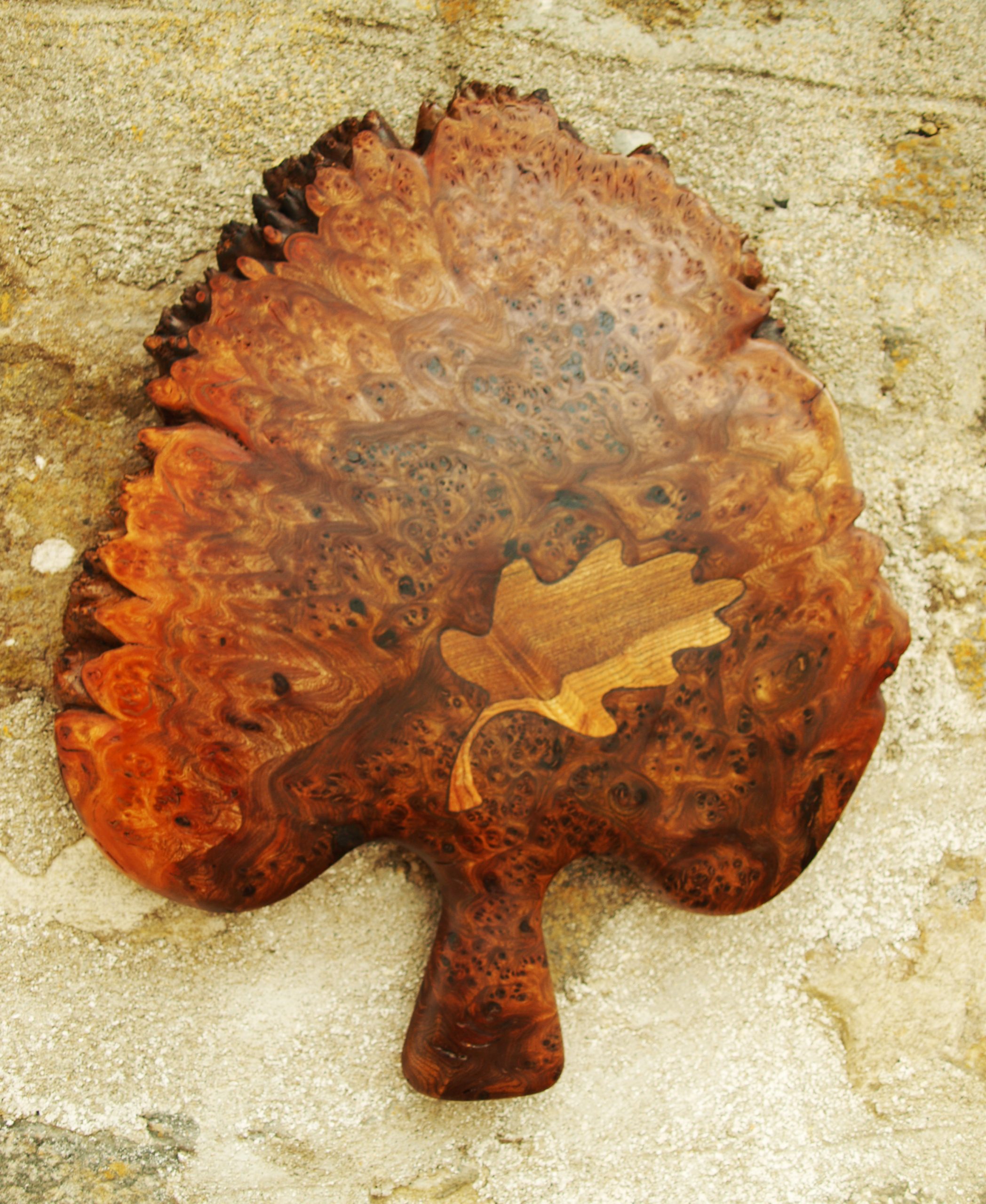 Floral wall-plaque carving in burr elm