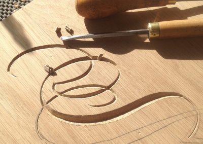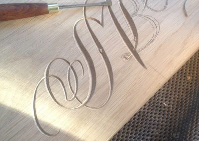 Hand-carved lettering on elm cake stand, wedding gift