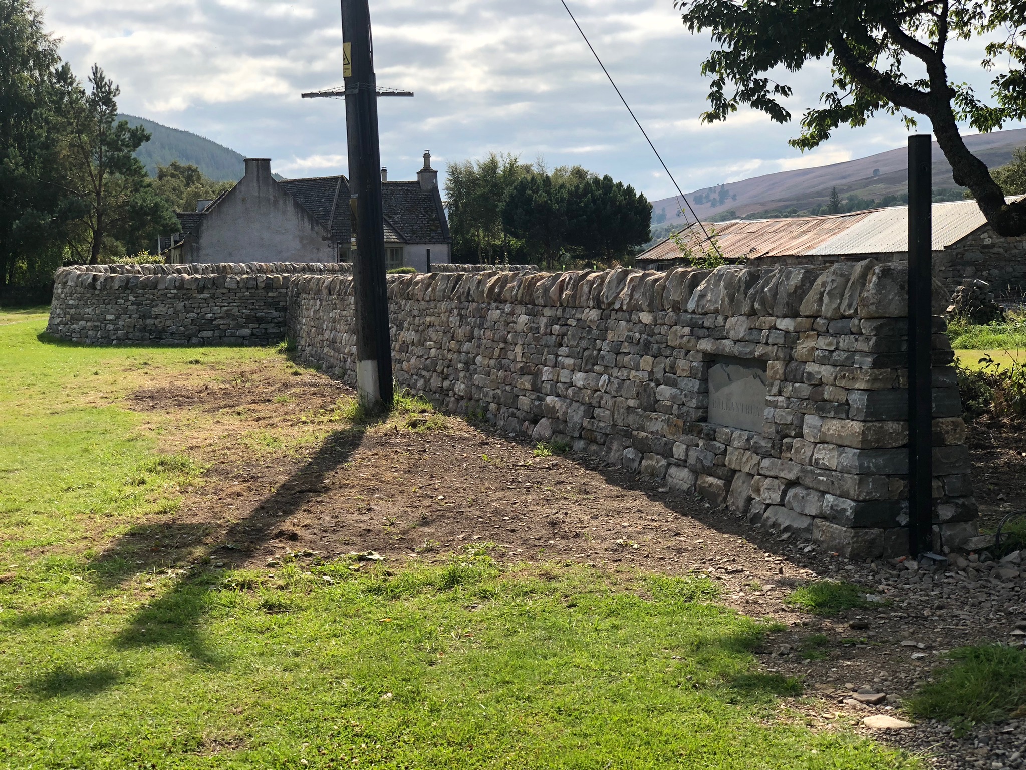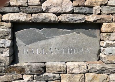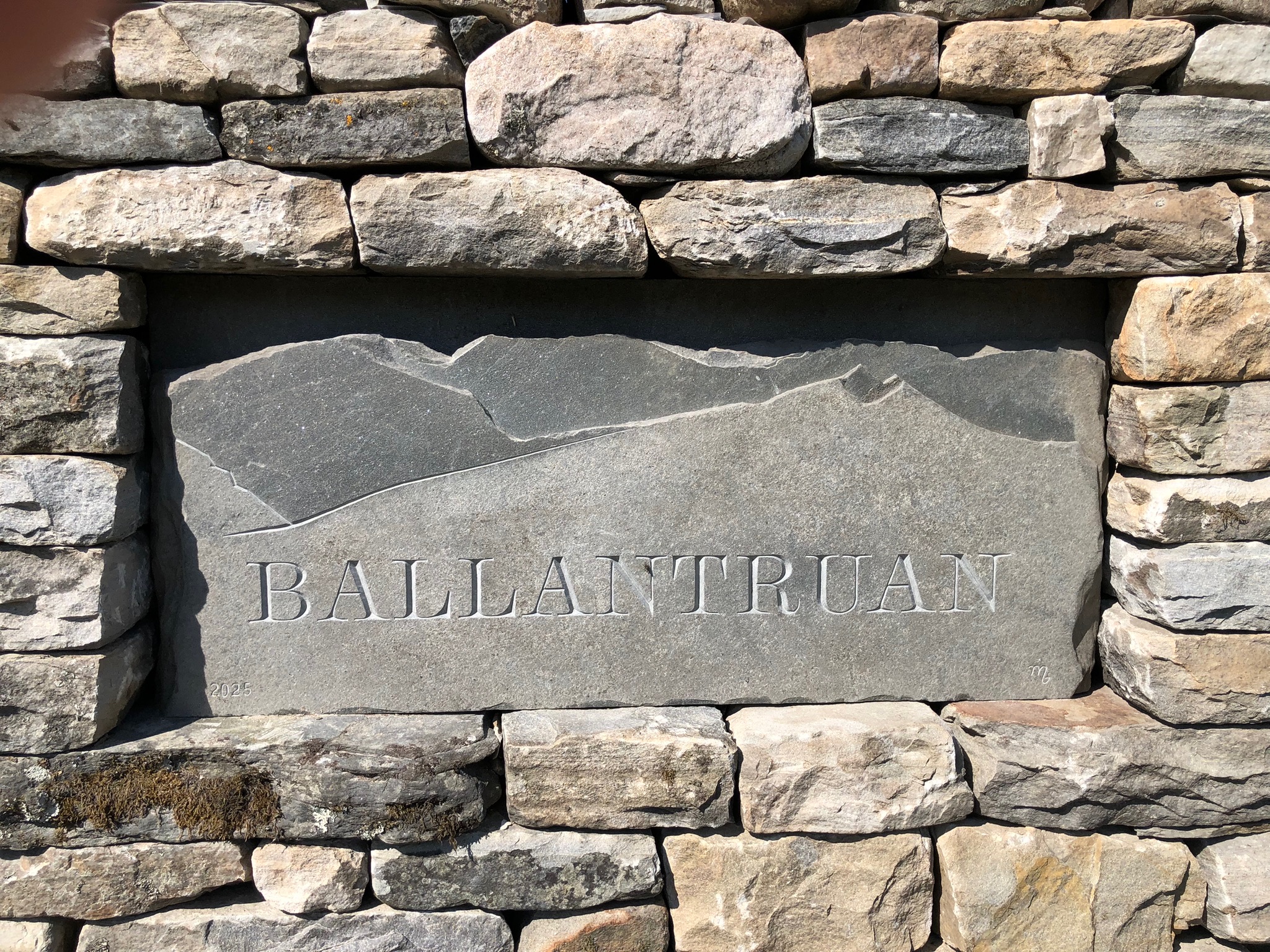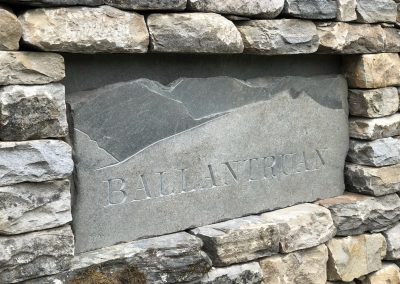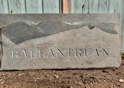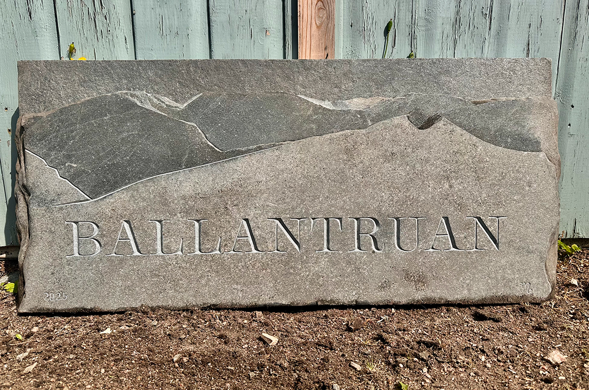 This was a lovely project to work on. I was approached by the owners of an 18th century former tax house in Glen Avon to produce a house sign for the property. Some time ago when previous owners were redeveloping the property, they lifted a number of large stone slabs from the old kitchen floor. These measured up to nearly a meter across and turned out to be Knockfergan (Cnoc fergan) slates from the nearby abandoned quarry. One slab in particular stood out for us while we were inspecting them. Parts of the front face had fallen away leaving an outline looking like a mountainous outline. We could be forgiven for seeing a resemblance to nearby Ben Rinnes. I simply added in some carvings of valleys to cement the idea. The typeface was chosen as it echoes inscriptions on headstones in the nearby Kirkmichael graveyard. The sign was then installed in the beautiful dry stone wall created by local stone dyker, Euan Thompson.