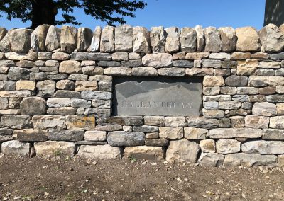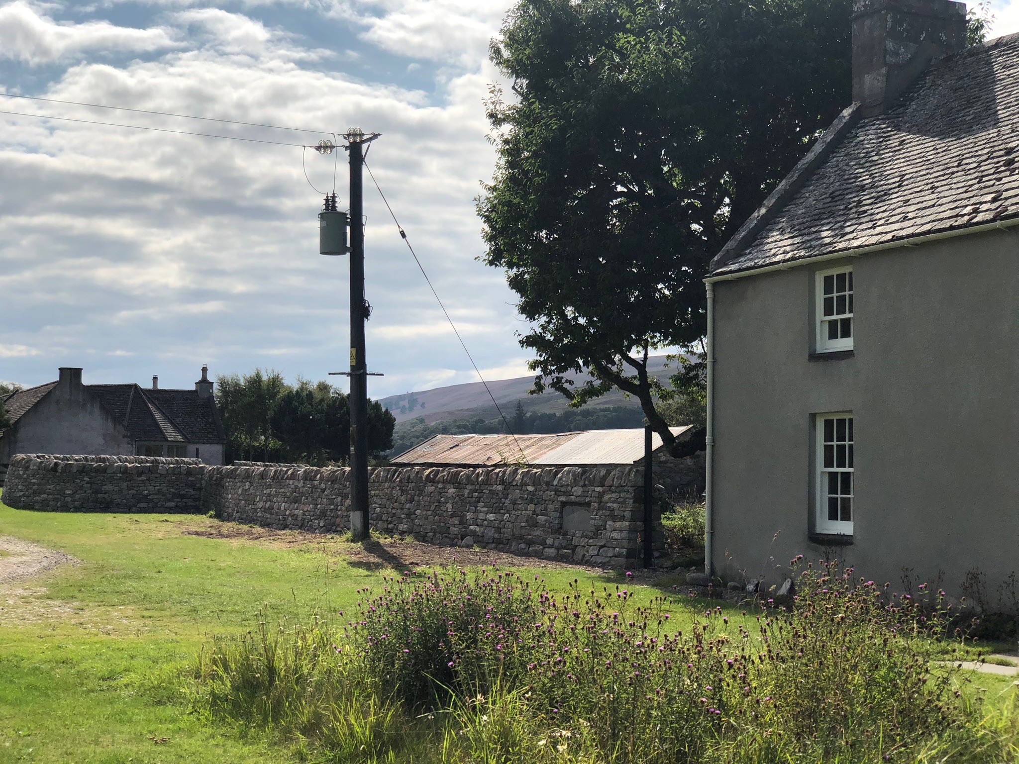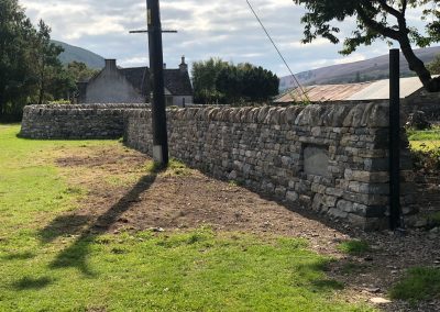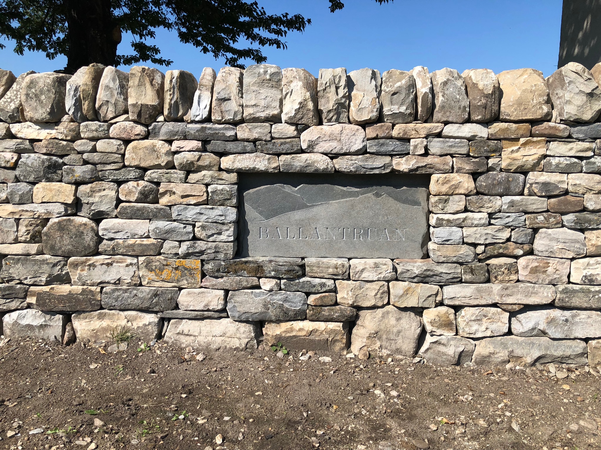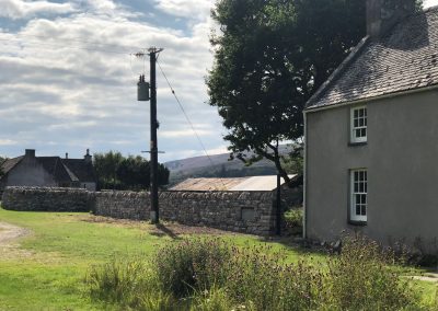 This was a lovely project to work on. I was approached by the owners of an 18th century former tax house in Glen Avon to produce a house sign for the property. Some time ago when previous owners were redeveloping the property, they lifted a number of large stone slabs from the old kitchen floor. These measured up to nearly a meter across and turned out to be Knockfergan (Cnoc fergan) slates from the nearby abandoned quarry. One slab in particular stood out for us while we were inspecting them. Parts of the front face had fallen away leaving an outline looking like a mountainous outline. We could be forgiven for seeing a resemblance to nearby Ben Rinnes. I simply added in some carvings of valleys to cement the idea. The typeface was chosen as it echoes inscriptions on headstones in the nearby Kirkmichael graveyard. The sign was then installed in the beautiful dry stone wall created by local stone dyker, Euan Thompson.