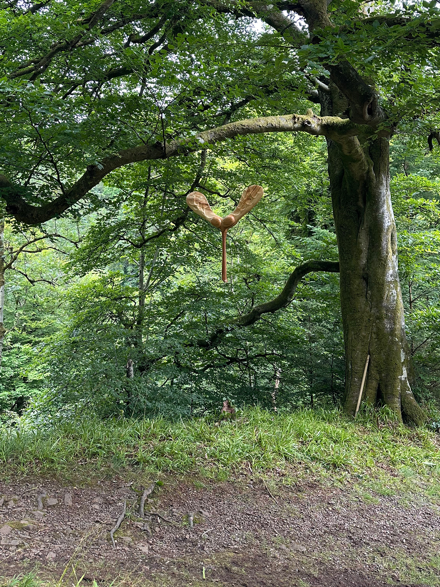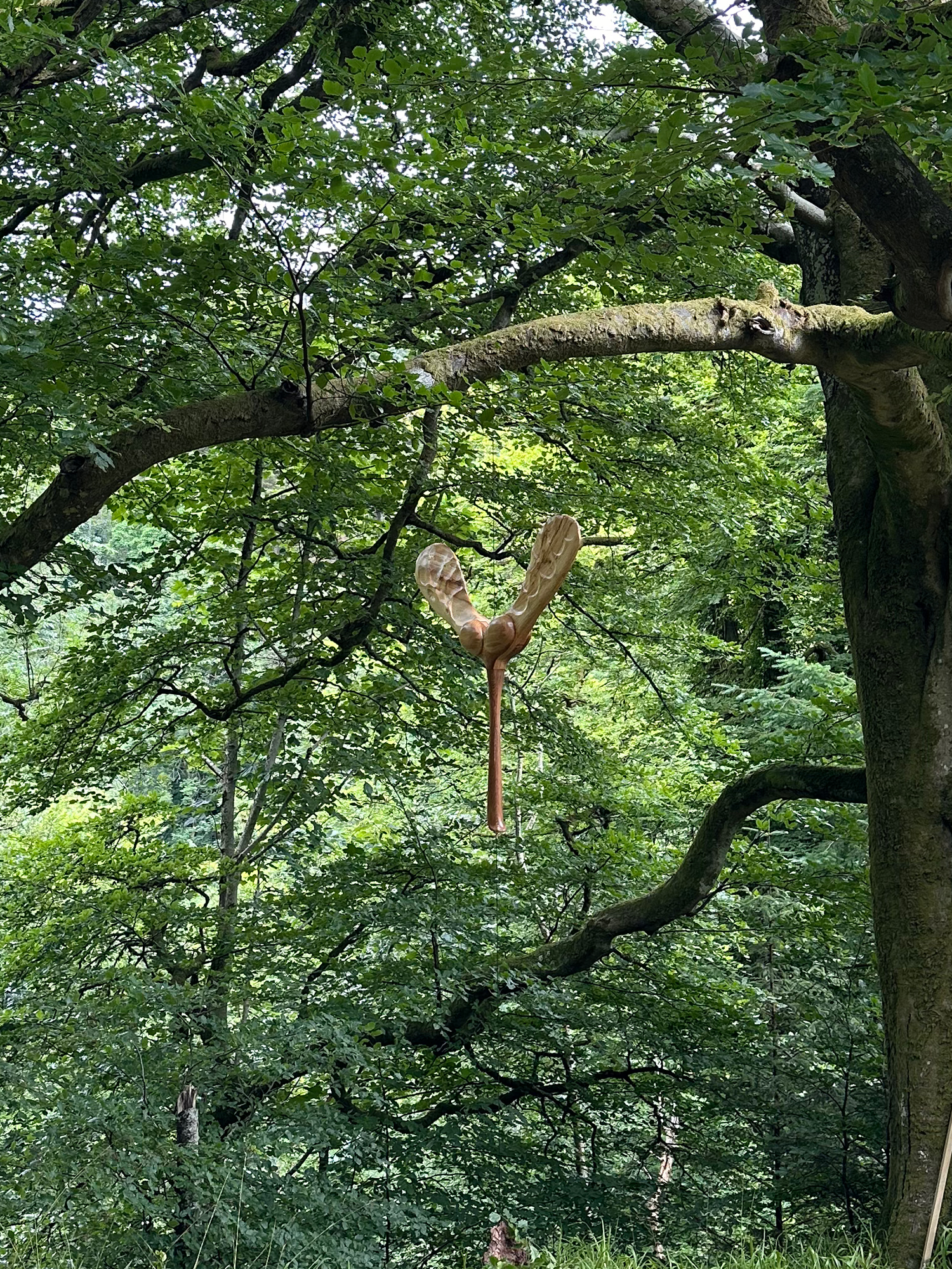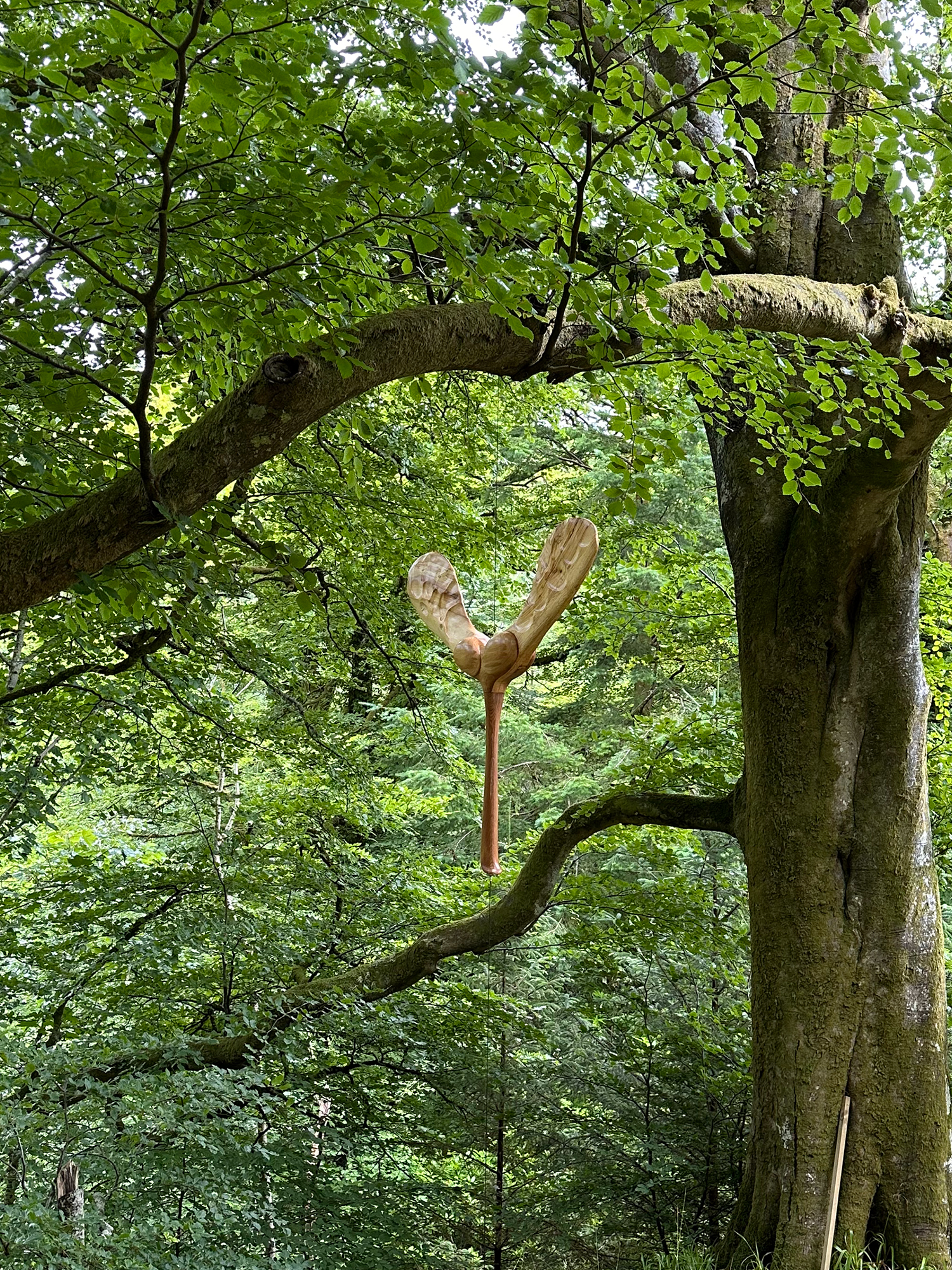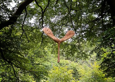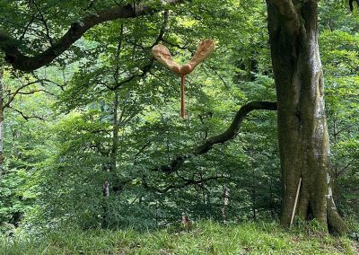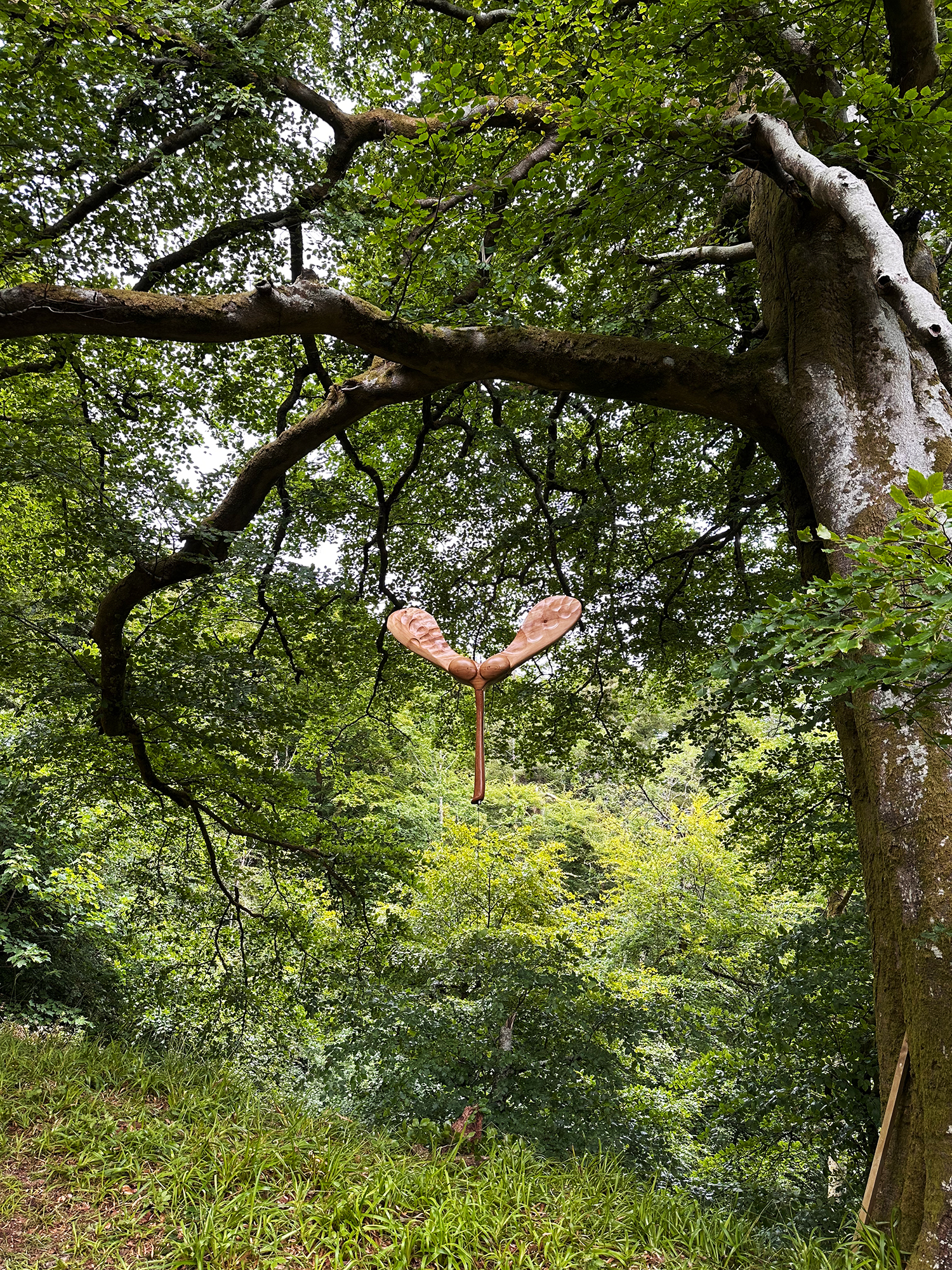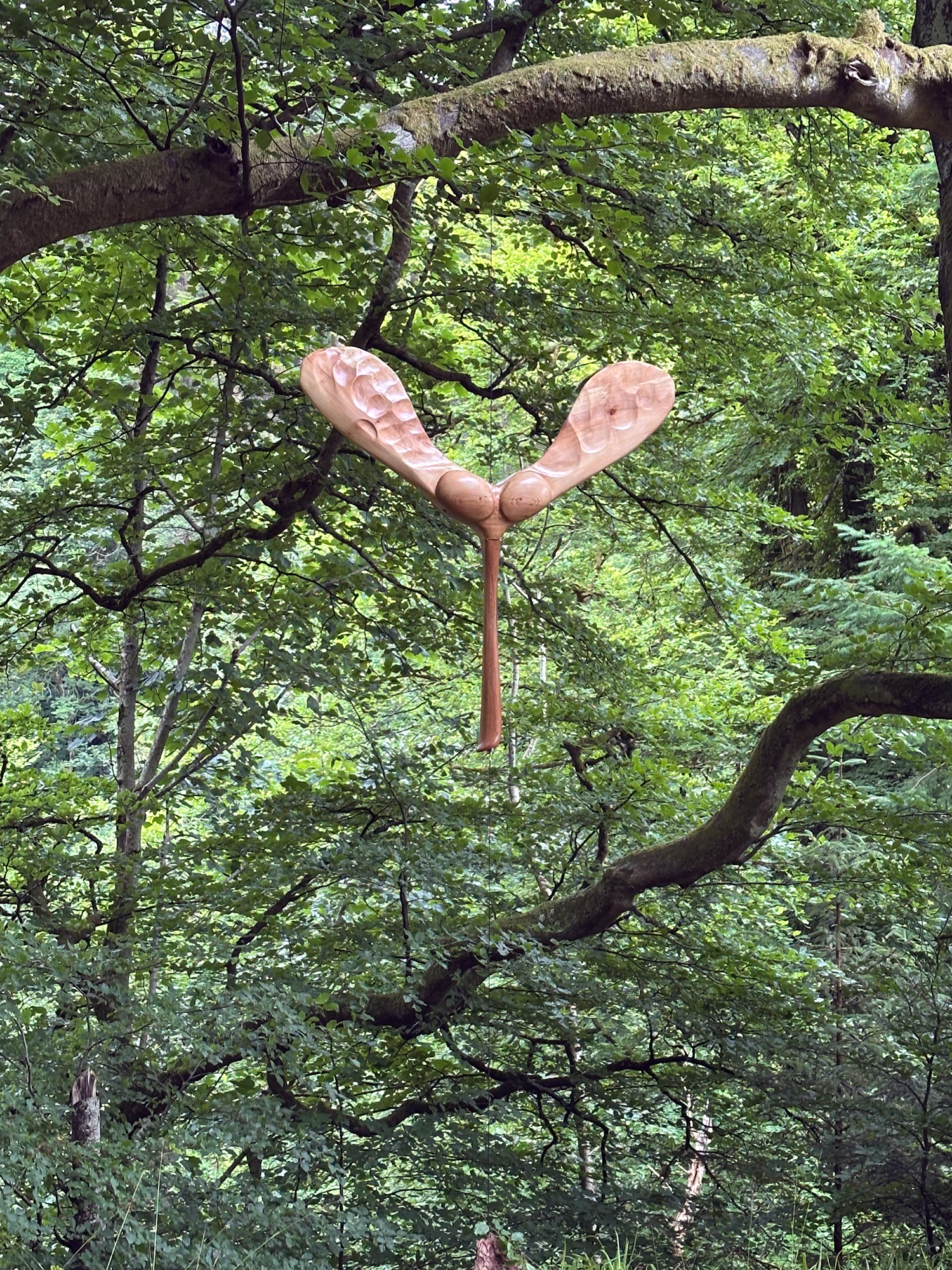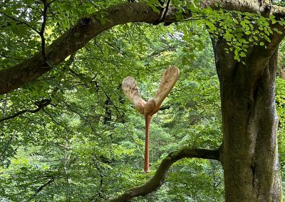I created a new sycamore seed “helicopter” called “On ya’ way” that sits in the tree canopy above the ravine in the stunning setting around Kelburn Castle. The sculpture is hand-carved from local sycamore wood with oak for contrast. It is suspended from a large bough of a tree using taut steel rope and contains bearings in order to allow it to spin in the breeze.