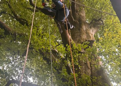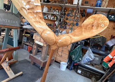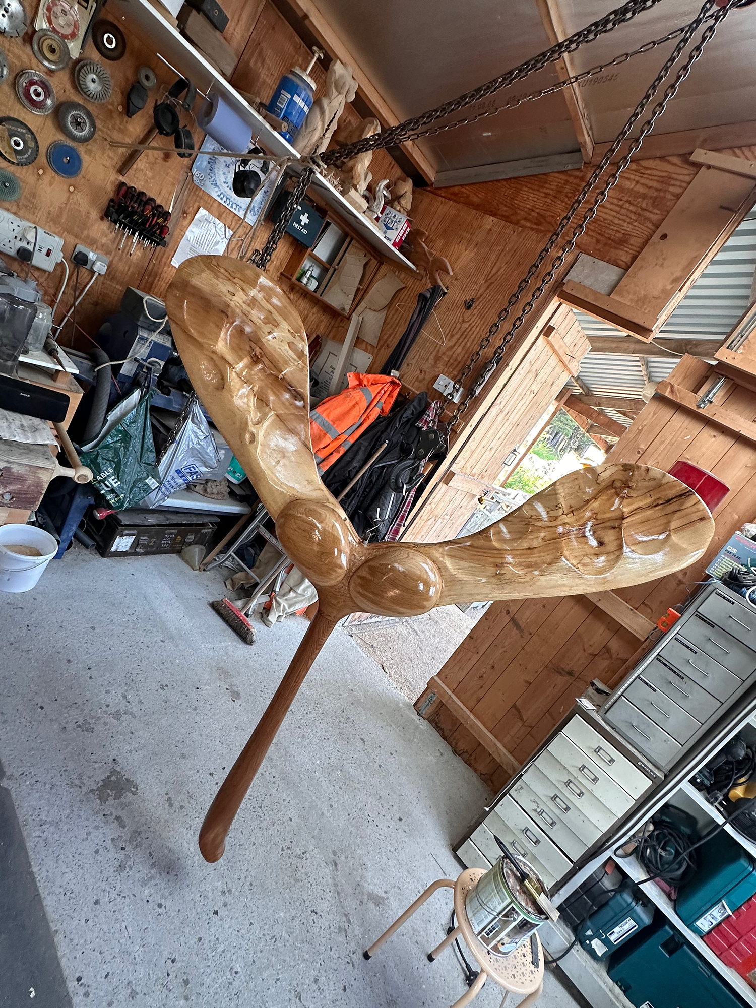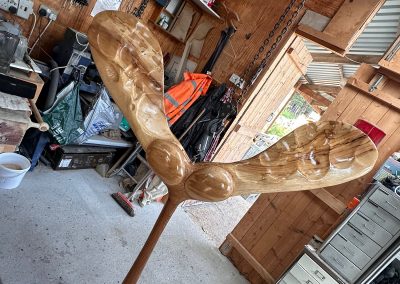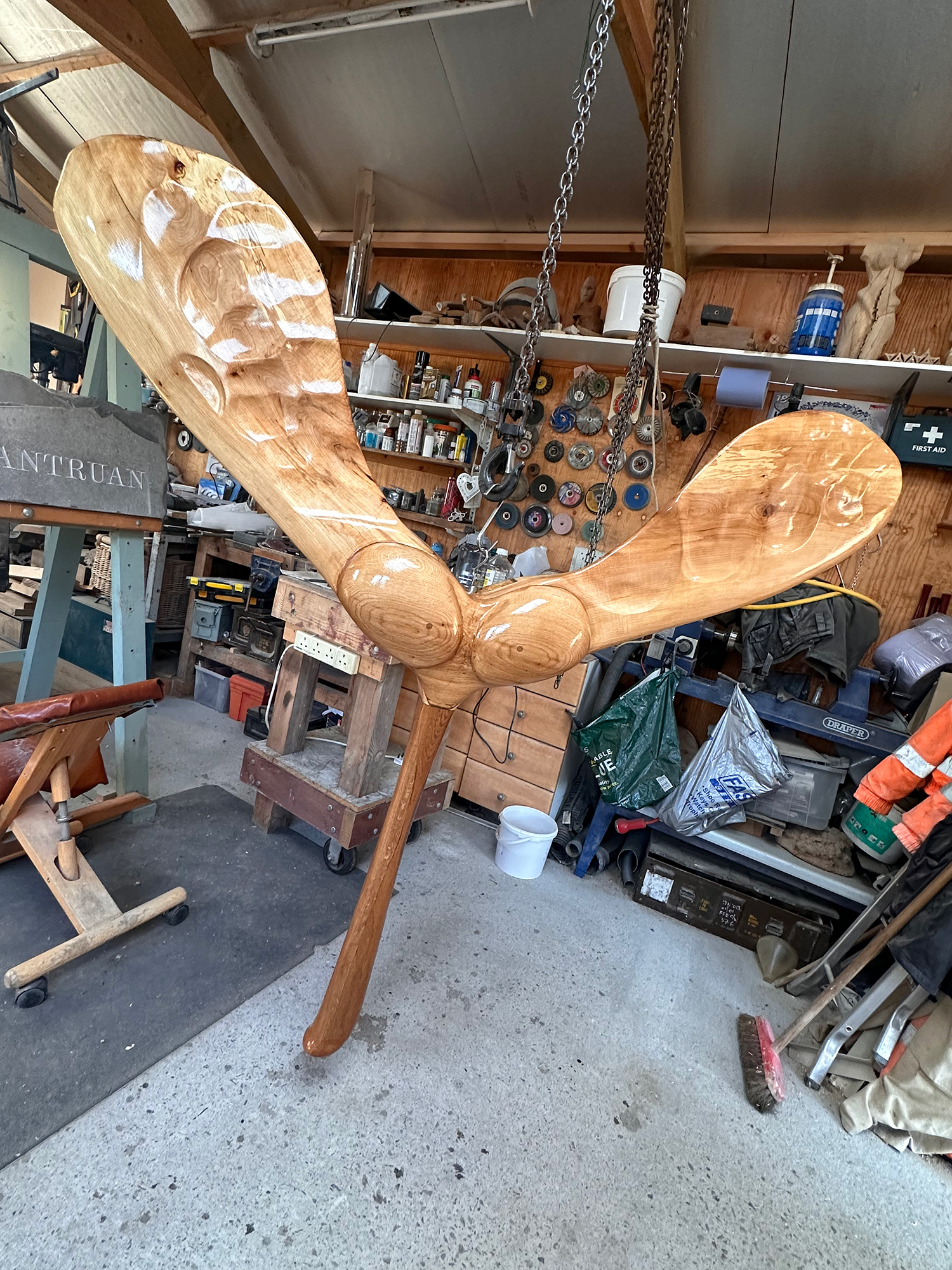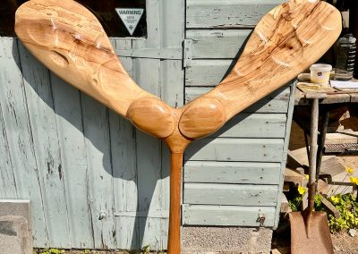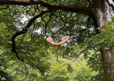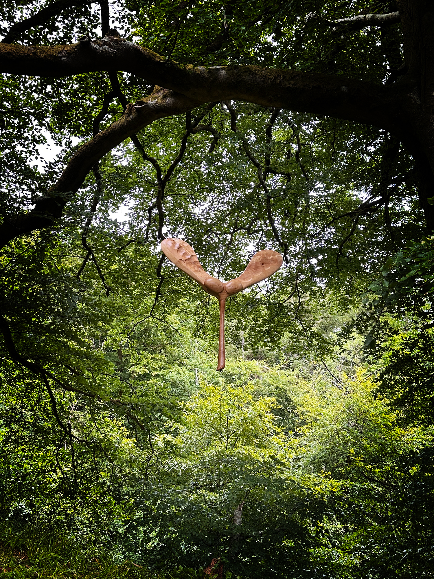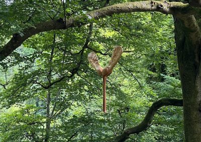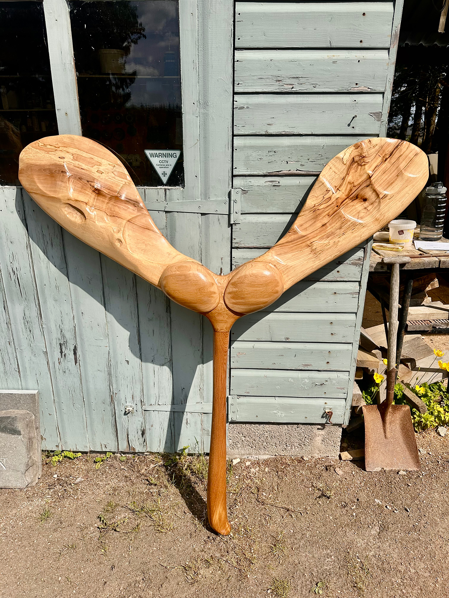 I created a new sycamore seed “helicopter” called “On ya’ way” that sits in the tree canopy above the ravine in the stunning setting around Kelburn Castle. The sculpture is hand-carved from local sycamore wood with oak for contrast. It is suspended from a large bough of a tree using taut steel rope and contains bearings in order to allow it to spin in the breeze.