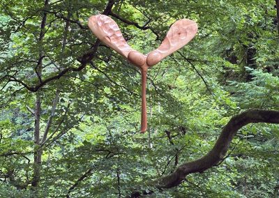 These great big trees go through an incredible process through the year in order to produce these tiny seeds. Throughout the process the seed itself evolves and grows. It even changes shape in order to maximise its efficiency just to do one thing – to travel as far as it can in order to start another new tree. For most of its life it’s firmly attached to its parent and then, if it’s lucky, it becomes firmly embedded in the ground but for a brief, fleeting moment it travels. It catches the breeze and it flies. It occurred to me as I watched my sculpture hover among the trees that I had captured that very short moment in its life.
